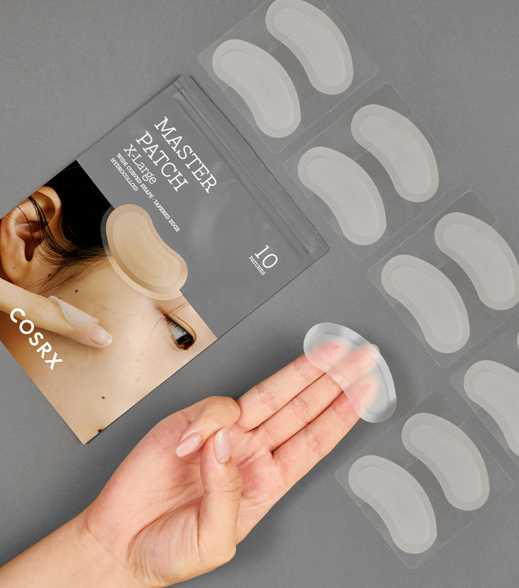 Parche hidrocoloide en tamaño extragrande diseñado para cubrir y tratar áreas amplias de brotes de acné, proporcionando protección, acelerando la cicatrización y ayudando a disminuir manchas oscuras.